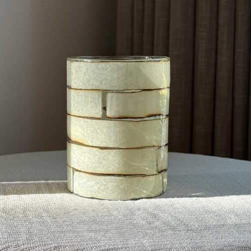 • Crèmekleurige glazen kaarsenhouder met subtiele bruine strepen